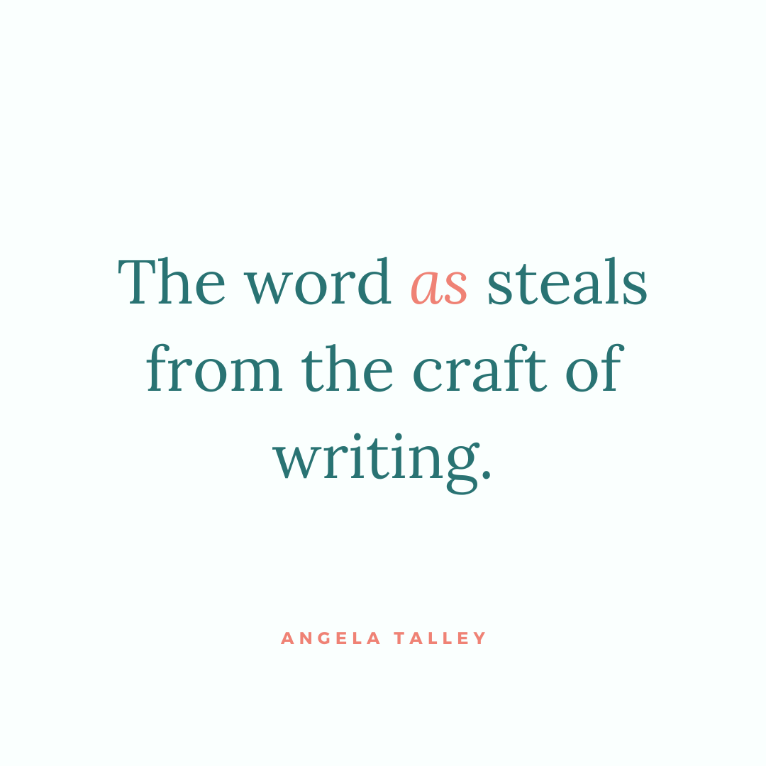 Of course, you don’t have to change every single instance where you use the word as. But here’s your friendly reminder to write, write, write. Write your drafts like a bursting dam, but when it comes time to edit, I challenge you to suck out the word as and see what your writing can turn into.